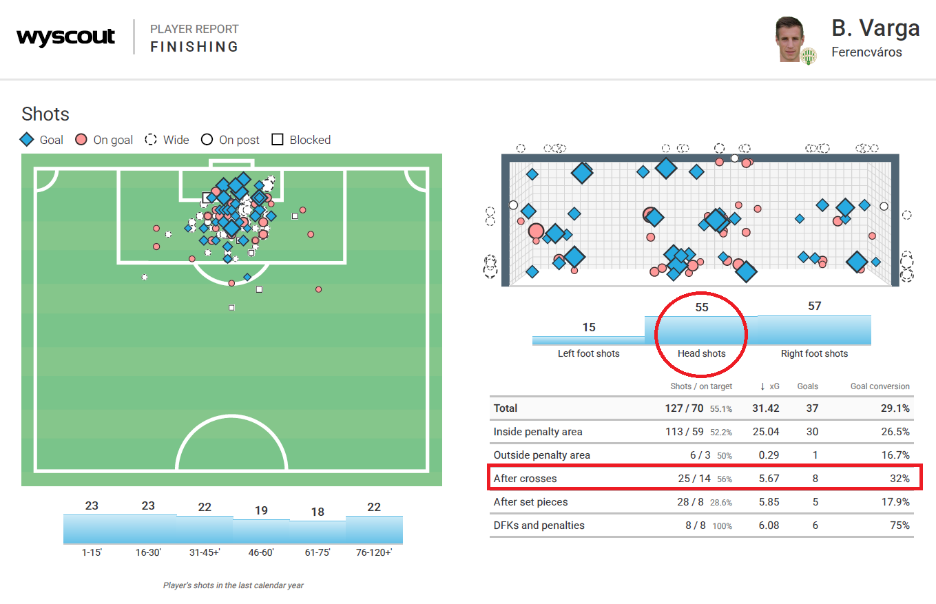 Ha az elmúlt egy év teljesítményét vesszük figyelembe, Varga fejjátéka nemzetközi szinten is hihetetlen statisztikákat produkál. Egyfelől majdnem ugyanannyi lövési kísérletet (55) jegyez fejjel, mint a jobbik lábával (57), másrészt párját ritkítóan zseniális arányban (32 százalék) váltja gólra lövéseit beadások után – márpedig ezek jelentékeny része fejes: